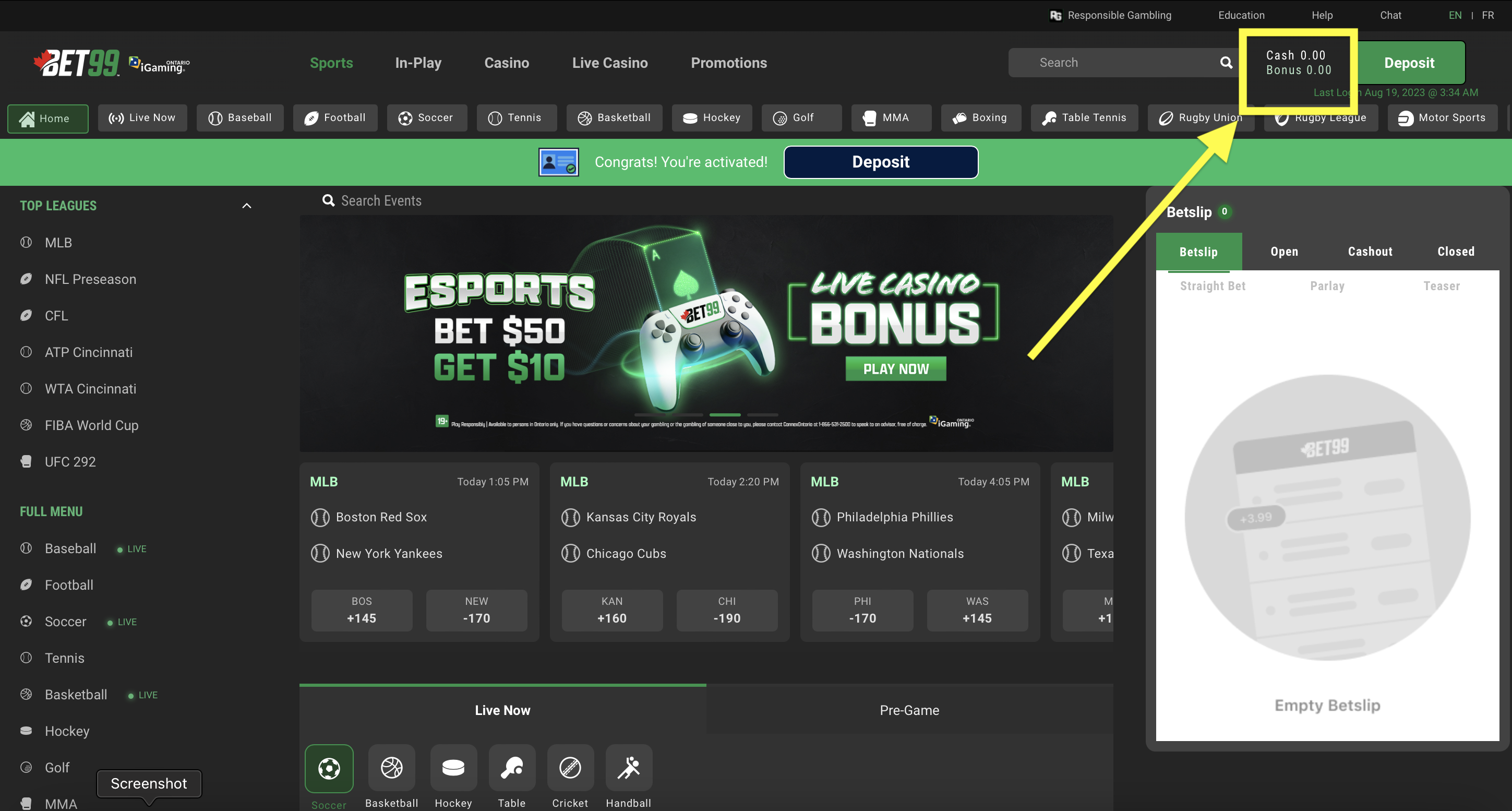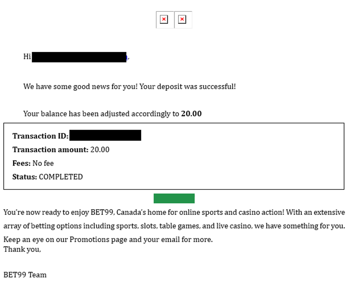 Going back to the BET99 website you will see a window with the details of the completed deposit and your balance.