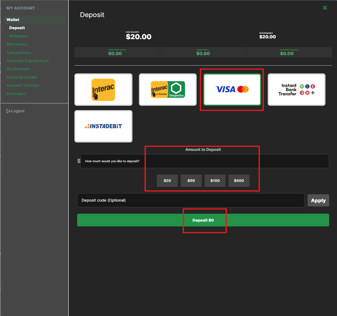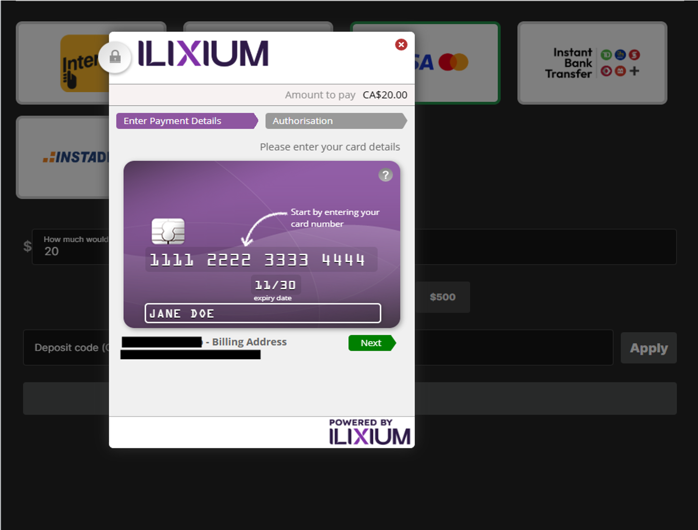 The system will offer you a list of available deposit methods. Select Visa/Mastercard, specify the desired deposit amount and then click “Deposit”