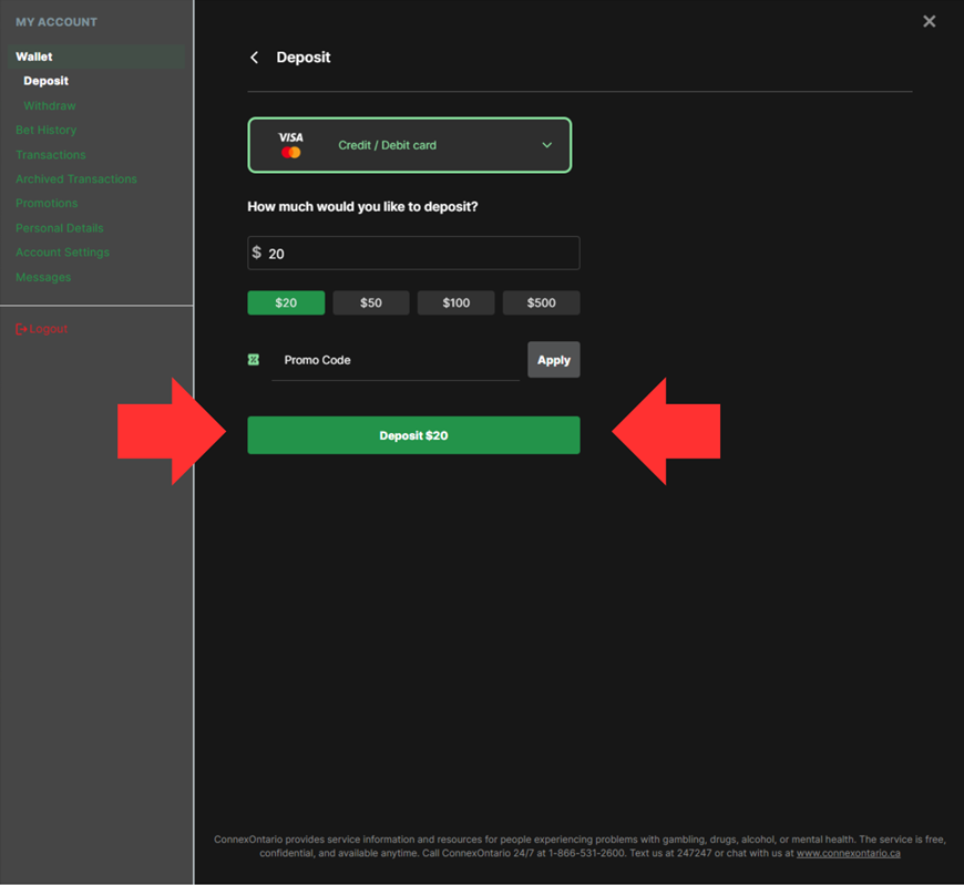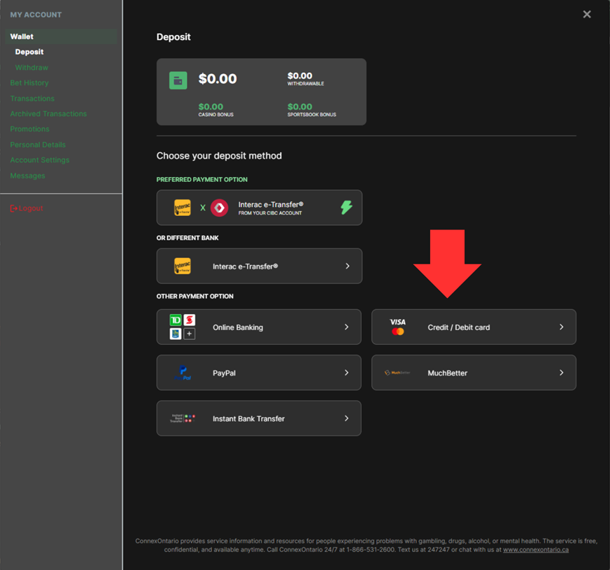 - Under Choose your deposit method, select Credit / Debit Card