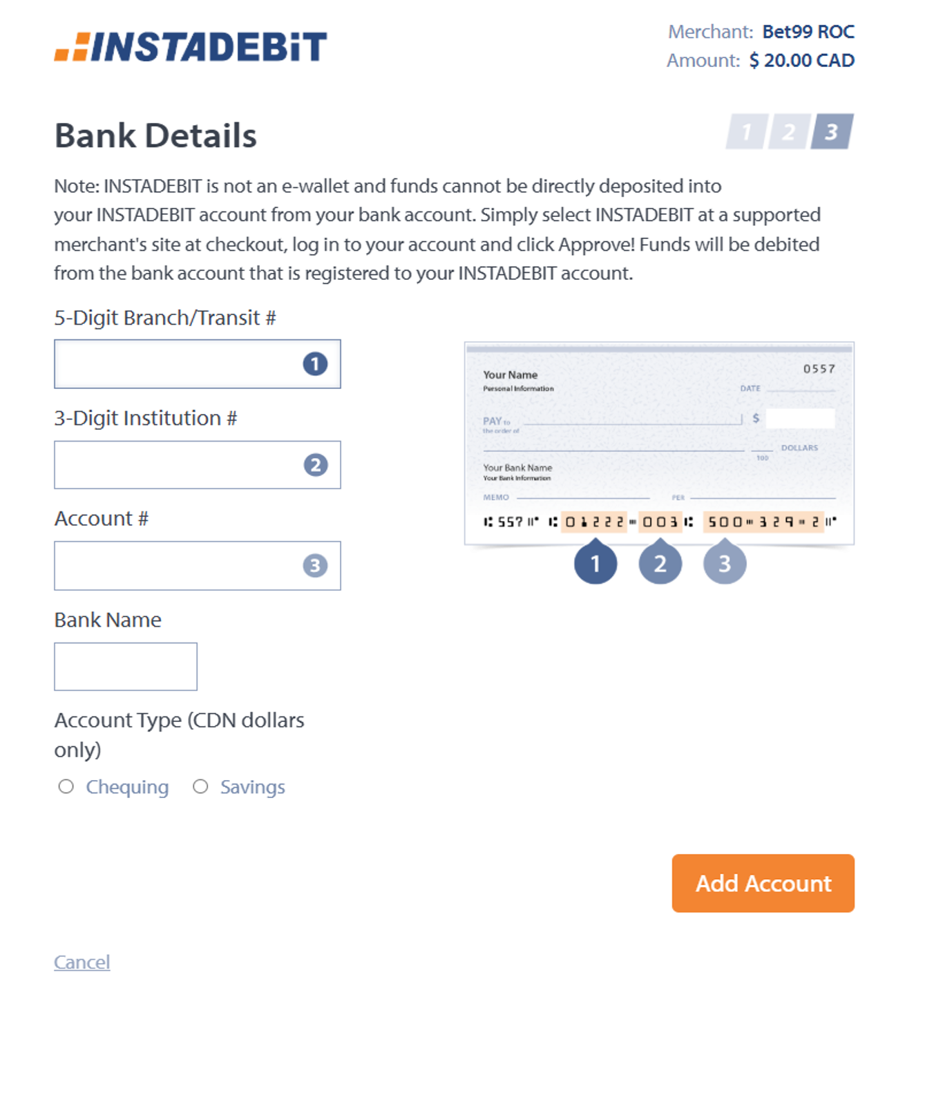 Enter the bank details of the account from which you wish to make a deposit to your BET99 account.