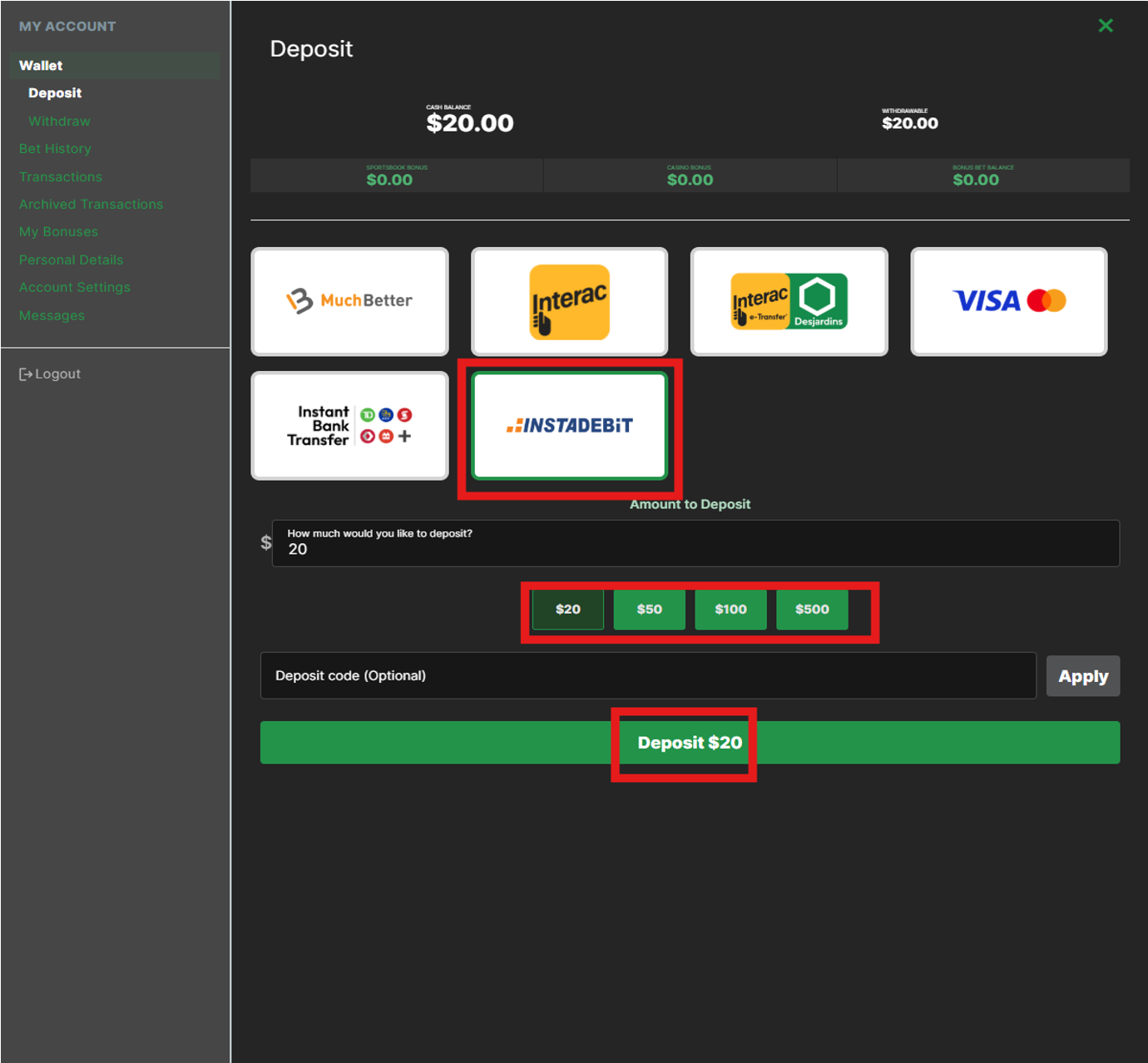 To initiate a deposit through Interac, you will first need to log into your BET99 account and then click on the “Deposit” button