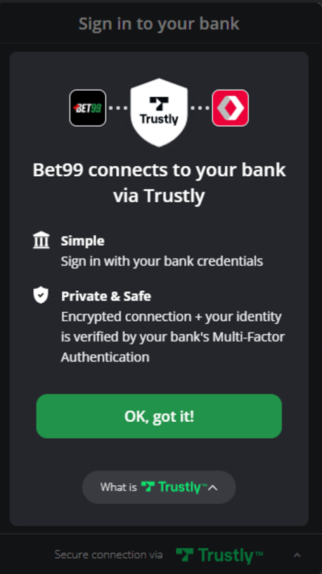 You can fund your BET99 account using Trustly, which allows you to make deposits directly through your online banking.