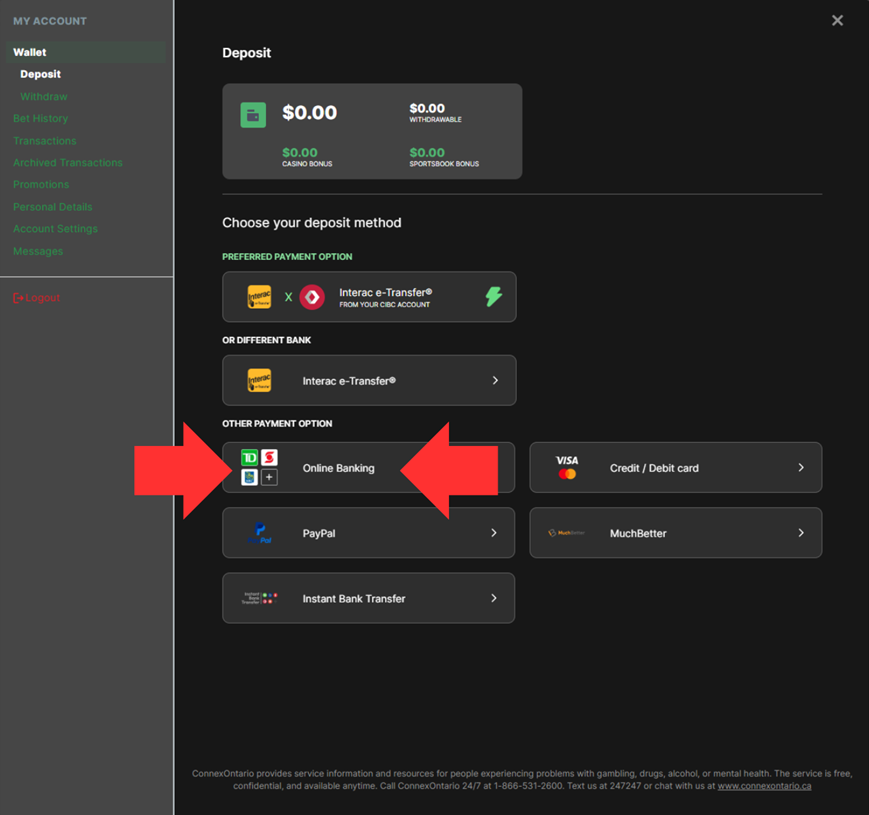 This will open the deposit window where you can choose your payment method.
