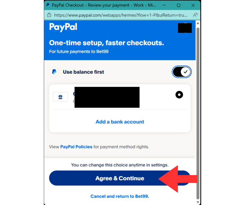 After logging in to PayPal, review the payment details and confirm the transaction by clicking Agree & Continue.