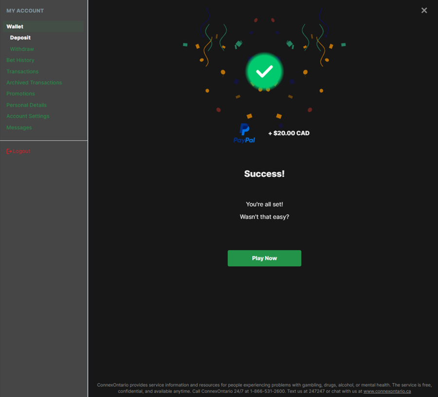 You will see a success confirmation screen, and BET99 will also send you an email confirming your successful deposit.